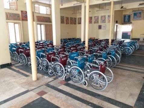 100 wheel chairs and strectures donated to poor physically handicapped people distributed in an event organized in Ramanagara for hadicapped people from all over karnataka. To help the poor who are in need.